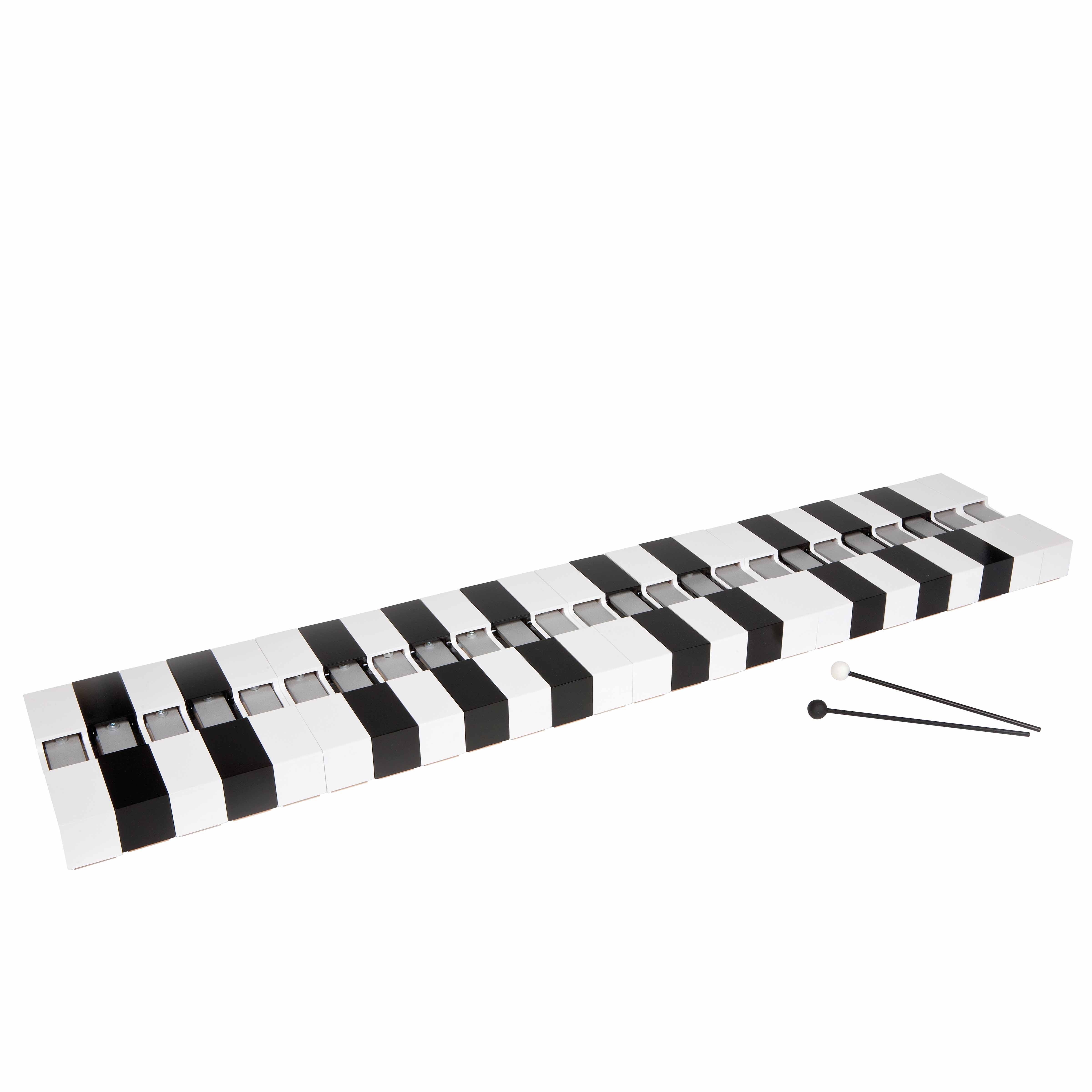 The tone bars are arranged like piano keys with both natural notes (white keys) and sharps/flats (black keys) covering a full chromatic scale. Each precision-tuned metal bar sits above its own resonating chamber, which amplifies and enriches the sound quality when struck.