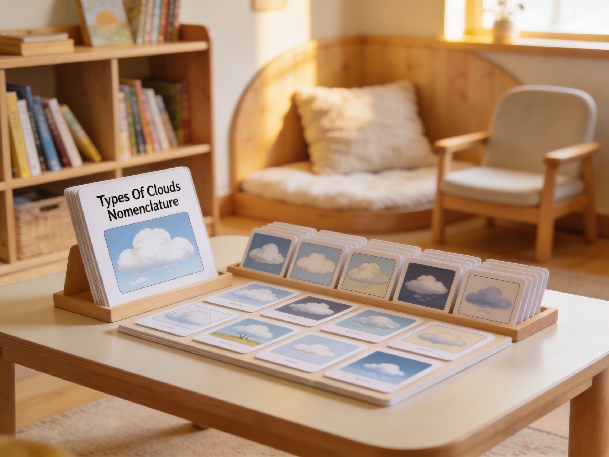 The Types Of Clouds Nomenclature is a Language Montessori material designed for children aged 3-6, crafted by Nienhuis Montessori to AMI standards.