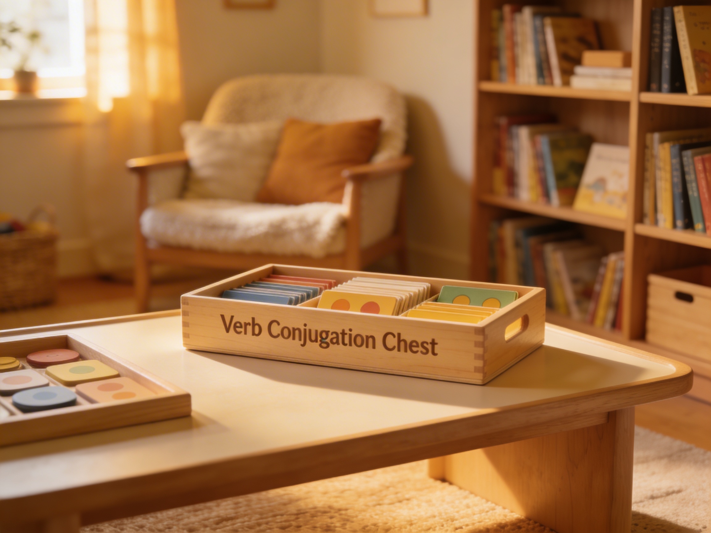 The Verb Conjugation Chest transforms abstract grammatical concepts into tangible explorations through its color-coded card system. Each brass-handled compartment within the wooden chest contains specific verb forms that children physically arrange, revealing language patterns through direct manipulation. Unlike traditional verb drills, this chest invites discovery as students open nested boxes to find conjugation cards organized by tense and person, making visible the logical structure underlying verb changes. The color-coding across multiple tenses allows children to perceive relationships between forms they might otherwise memorize in isolation. By handling these cards repeatedly, elementary students internalize conjugation patterns through sensorial engagement rather than rote learning. The chest's comprehensive organization mirrors the systematic nature of language itself, with each compartment serving as a concrete representation of grammatical categories that exist abstractly in speech.
