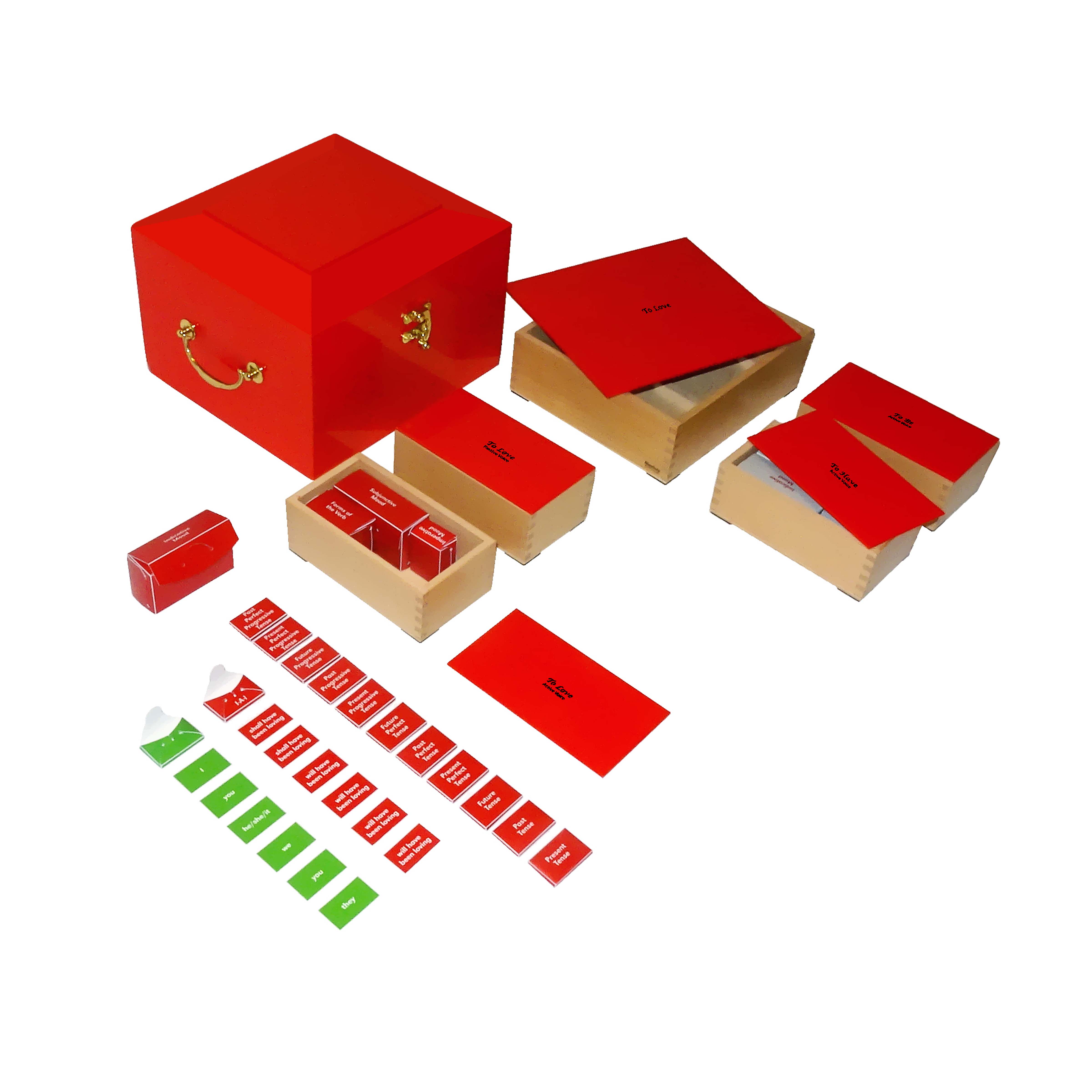 This comprehensive Verb Conjugation Chest provides systematic practice with verb forms across multiple tenses through color-coded card materials. The handcrafted wooden chest with brass handle contains nested storage boxes organizing conjugation cards by tense and person, supporting advanced grammar work in the elementary classroom. Each compartment holds specific verb forms, allowing children to explore patterns in language structure through hands-on manipulation of the cards.