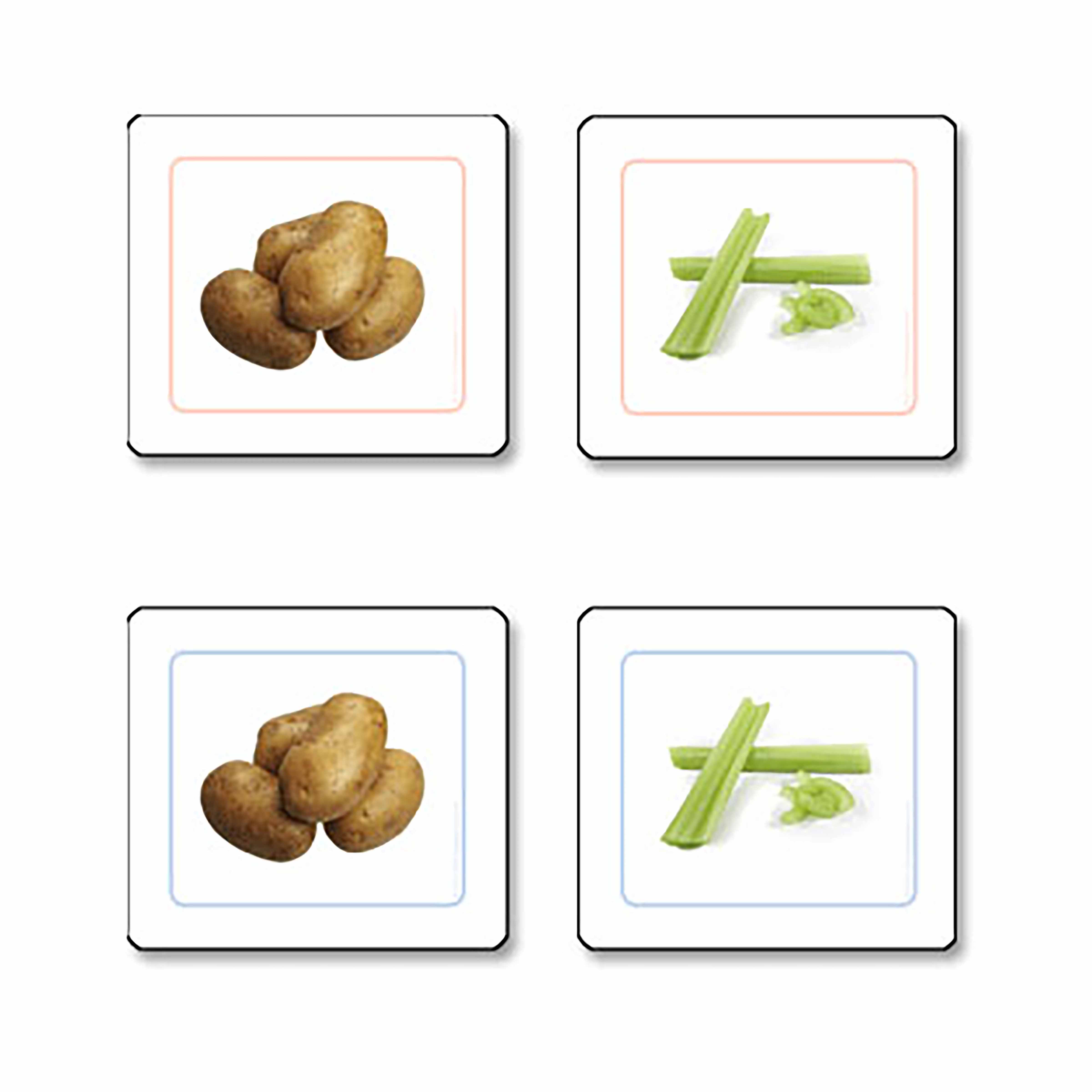 These vegetable matching cards introduce children to visual discrimination through familiar food items. Each laminated card features a clear photograph of common vegetables like potatoes and celery, framed with colored borders to support the matching process. The durable cardstock construction ensures these cards withstand repeated handling during classification and pairing activities.