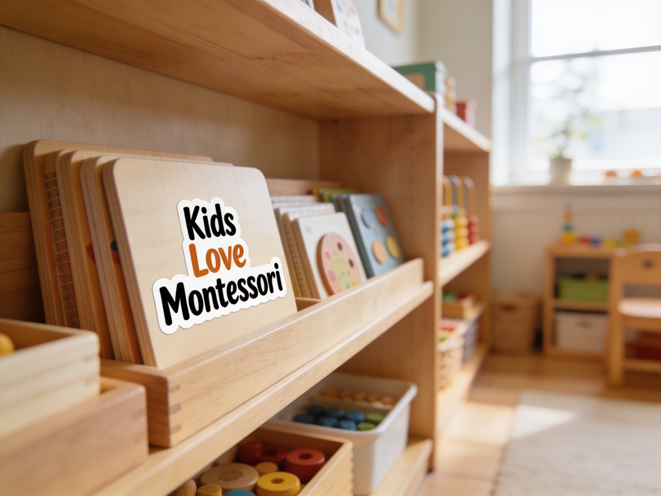 The 'Kids Love Montessori' vinyl sticker serves as a visual celebration of the child's positive relationship with their learning environment. This weather-resistant vinyl decoration creates opportunities for children to express their connection to their classroom community and educational journey. The vibrant red heart symbol on the sticker provides a concrete representation of abstract feelings, helping children ages 3-6 articulate their emotional attachment to their prepared environment. When children place this vinyl sticker on their belongings or see it displayed in their classroom, they experience a sense of belonging and pride in their educational community. The durable vinyl construction allows repeated handling and repositioning, encouraging children to make conscious choices about where to display their Montessori identity. Through decorating with this cheerful sticker, children practice decision-making skills while simultaneously building their classroom culture and sense of community ownership.