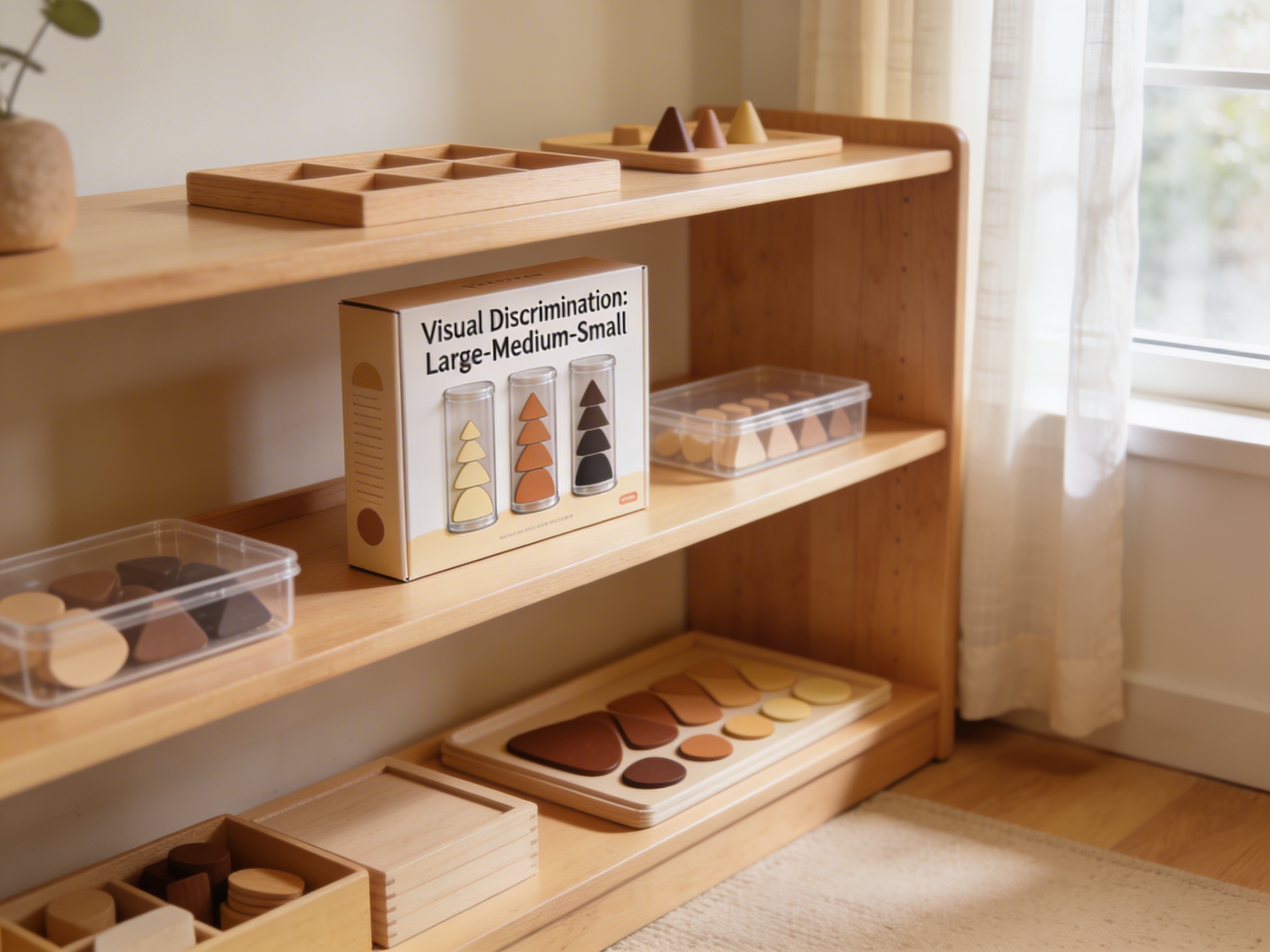 The Visual Discrimination: Large-Medium-Small is a Educational Materials Montessori material designed for children aged 3-6, crafted by Nienhuis Montessori to AMI standards.