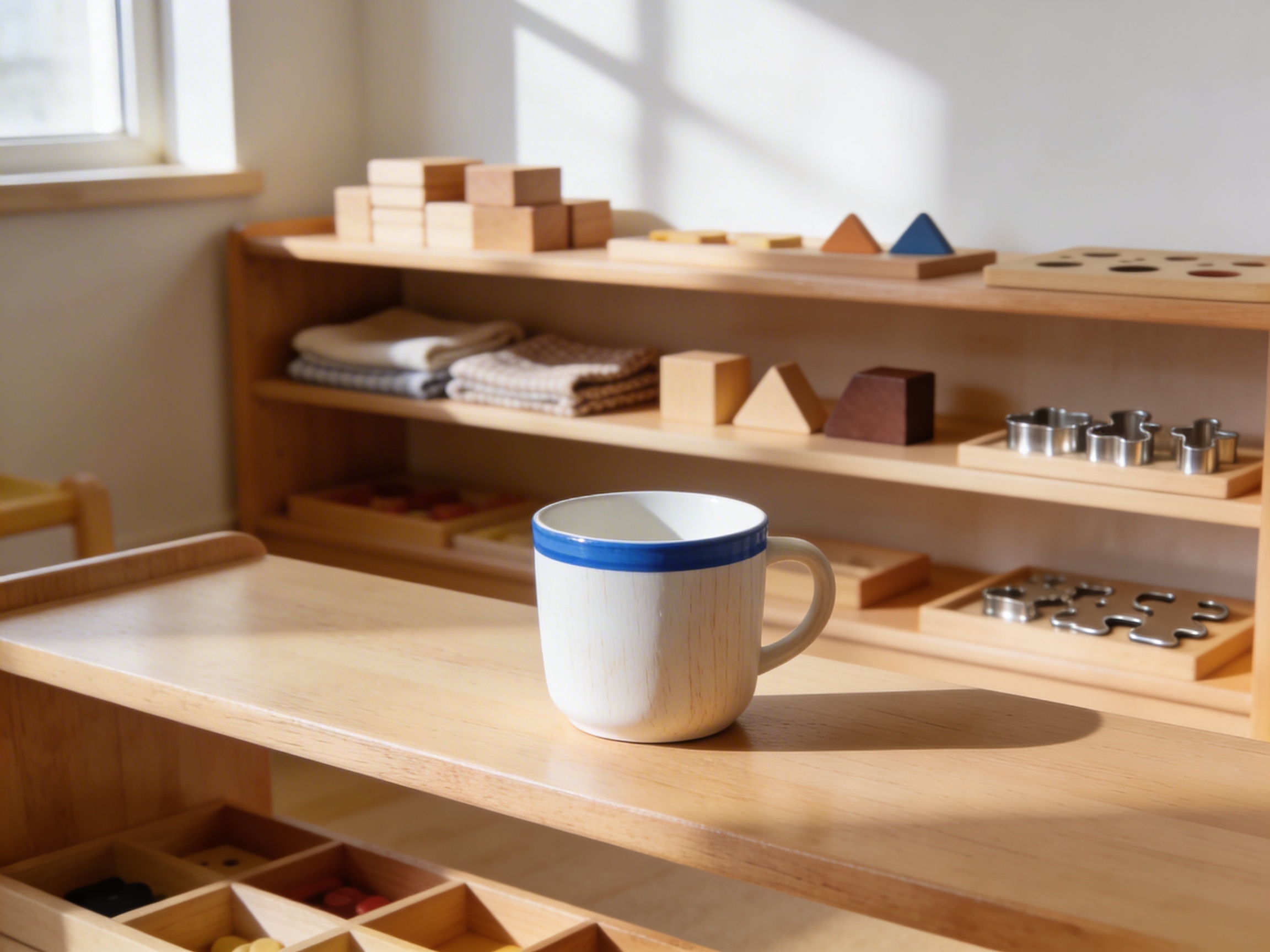 The ceramic bowl with its white exterior and blue interior represents a fundamental principle in Montessori education: beauty and contrast serve specific developmental purposes. This particular bowl's striking color combination creates visual interest that helps young children maintain focus during water transfer and food preparation activities. The ceramic material itself requires careful handling, developing the child's awareness of fragility and promoting gentle, controlled movements. When children pour water into this blue-glazed interior, they can clearly see the water level against the vibrant background, providing immediate visual feedback for their actions. The bowl's weight and smooth surface offer sensory information that guides the child's grip and movement patterns. In practical life exercises, this ceramic vessel becomes a tool for developing what Dr. Montessori called 'coordination of movement' - the harmonious working together of mind, will, and muscles that forms the foundation for all later learning.