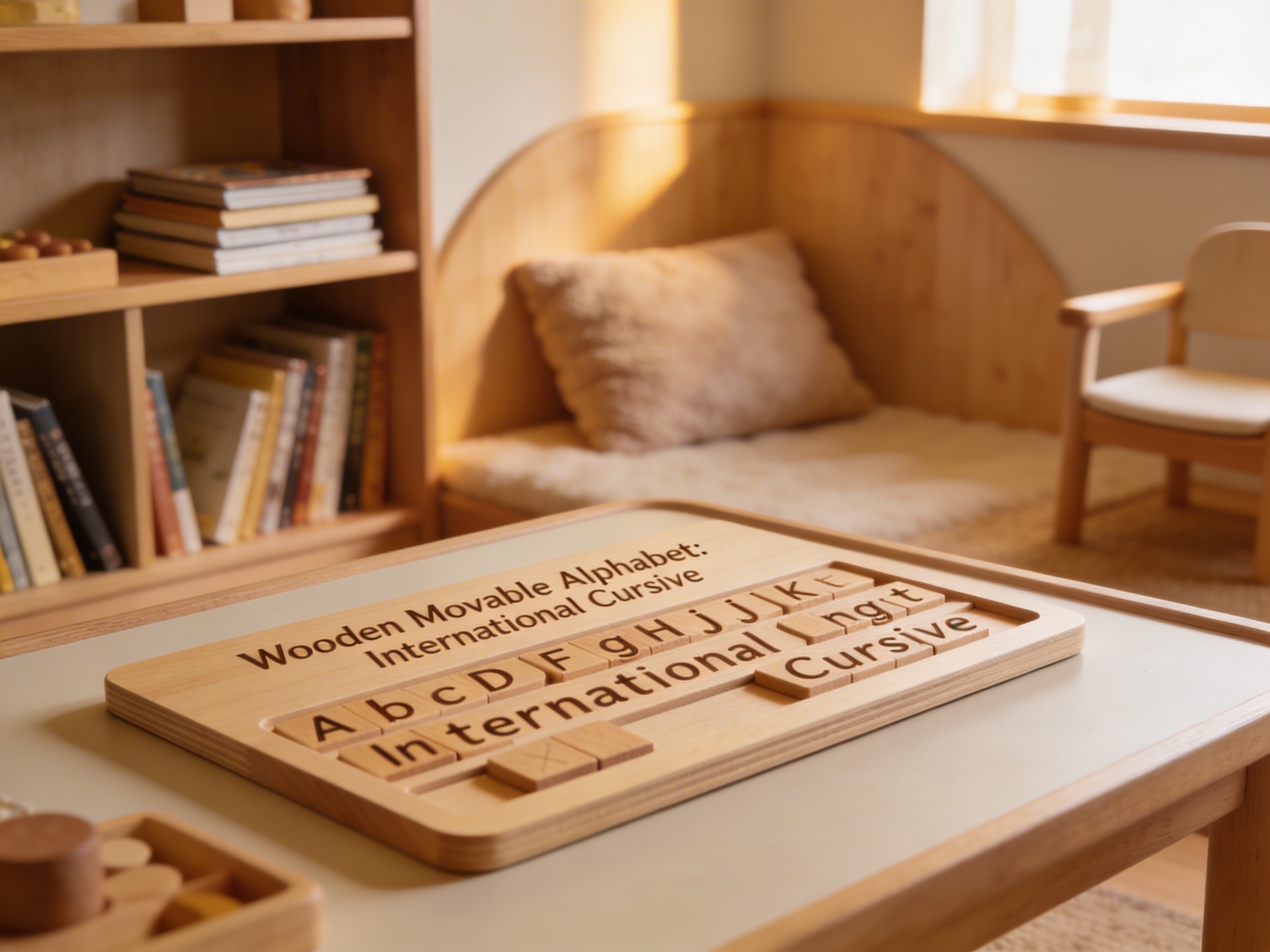 The Wooden Movable Alphabet: International Cursive is a Language Montessori material designed for children aged 3-6, crafted by Nienhuis Montessori to AMI standards.