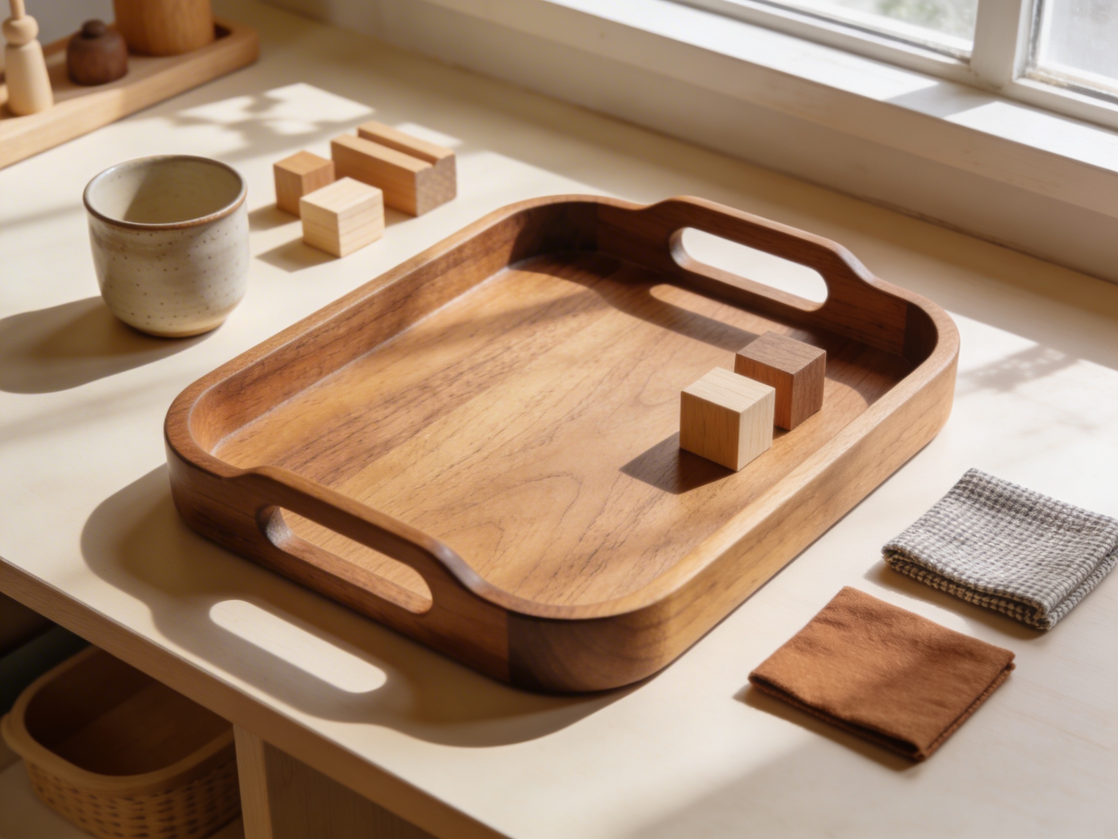 The tray is crafted from smooth plywood with a natural wood frame, featuring raised edges for safety and cut-out handles for secure gripping. All materials are child-safe and designed specifically for use by toddlers.