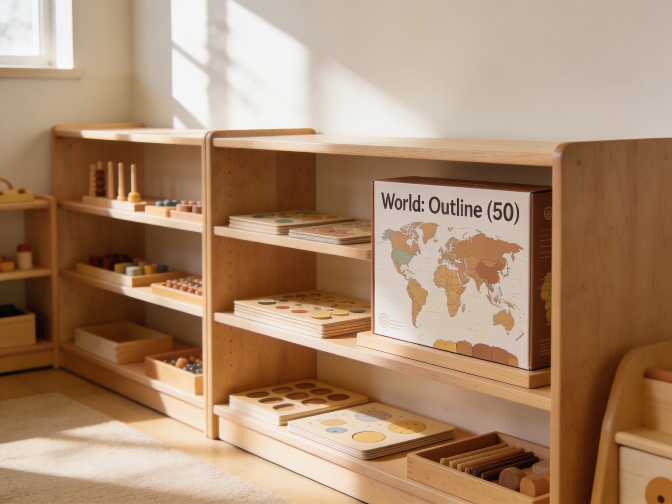 The World Outline poster serves as the foundation for the Geography curriculum in the Montessori classroom, introducing children to Earth's continents through clear, uncluttered black lines on white background. This simplified presentation of world geography allows young learners to first perceive the whole before exploring the parts, following Maria Montessori's principle of moving from concrete to abstract understanding. The high-contrast outlines enable children to visually isolate each continent's shape, supporting their developing visual discrimination skills essential for later map work. By presenting only the essential boundaries without colors, labels, or additional details, this outline map respects the child's need for order and clarity during the sensitive period for geography between ages 3-6. The poster's design invites children to actively engage through tracing, coloring, and creating their own representations of Earth's land masses, transforming passive observation into dynamic exploration of our planet's physical structure.