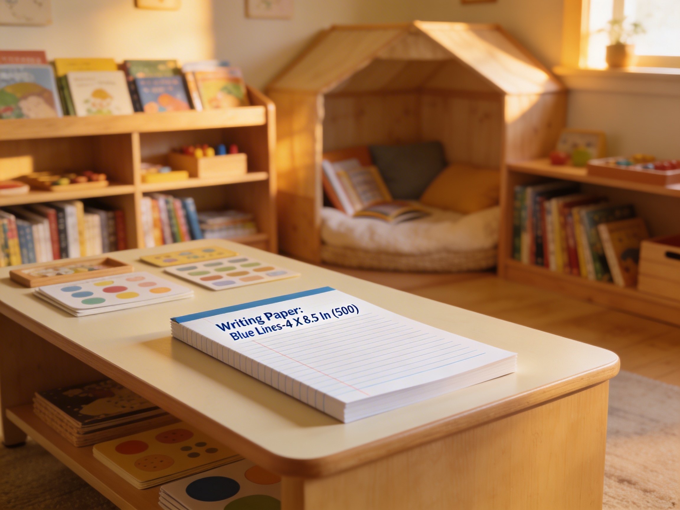 Writing Paper with Blue Lines serves a critical bridge in the Montessori language curriculum, offering children a structured transition from tracing sandpaper letters to forming letters independently on paper. The blue guide lines create visual boundaries that help young hands understand where letters sit, how tall they should be, and where they descend below the baseline. This specific 4 x 8.5 inch format provides ample space for children's naturally larger motor movements while the blue lines offer gentle guidance without overwhelming the child's visual field. The 500-sheet quantity recognizes that mastering handwriting requires extensive repetition - each sheet represents an opportunity for the child to refine their pencil grip, practice letter formation, and eventually express their own thoughts in writing. Unlike traditional lined paper, these blue lines are specifically calibrated for the developmental stage when children are coordinating their finger movements with their growing understanding of written symbols.