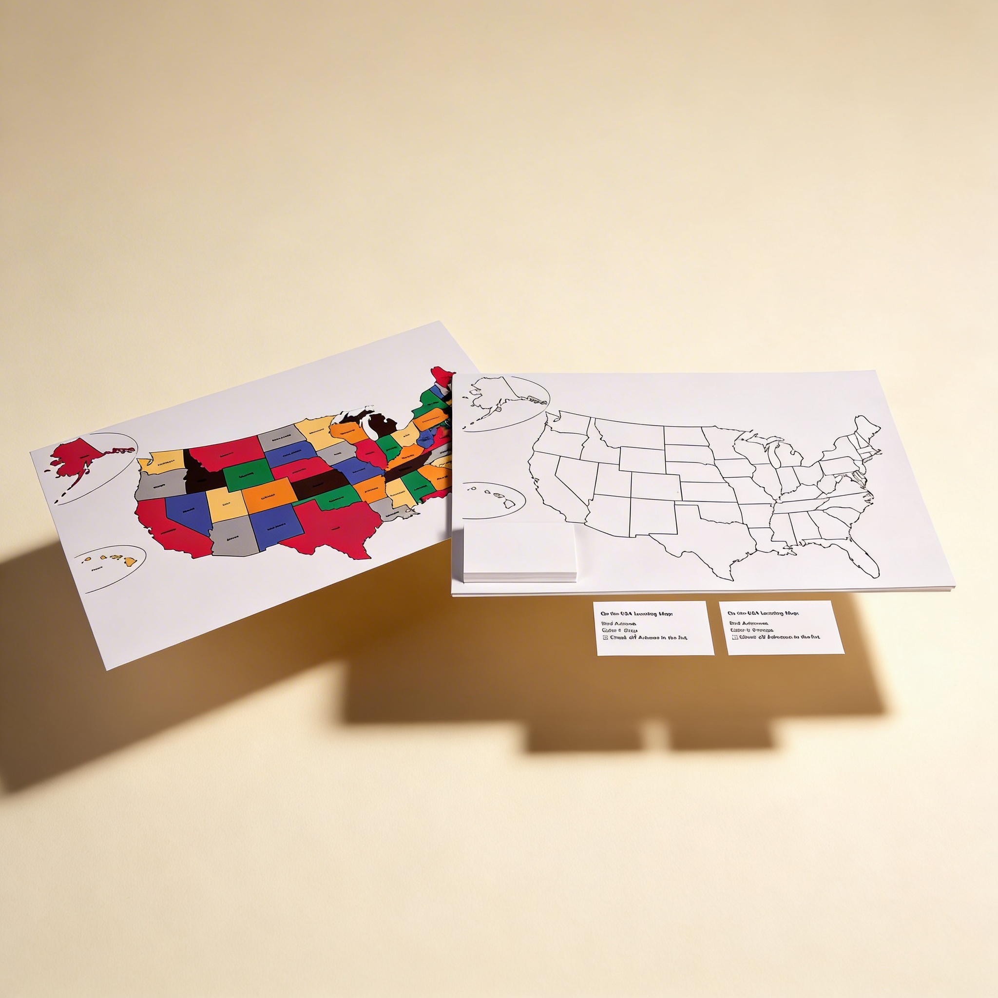 Sada obsahuje živú farebne kódovanú mapu Spojených štátov, prázdnu cvičnú mapu na vyplnenie deťmi a 50 zodpovedajúcich lokalizačných kariet reprezentujúcich každý štát. Všetky materiály sú navrhnuté pre praktický prieskum a samoopravenie.